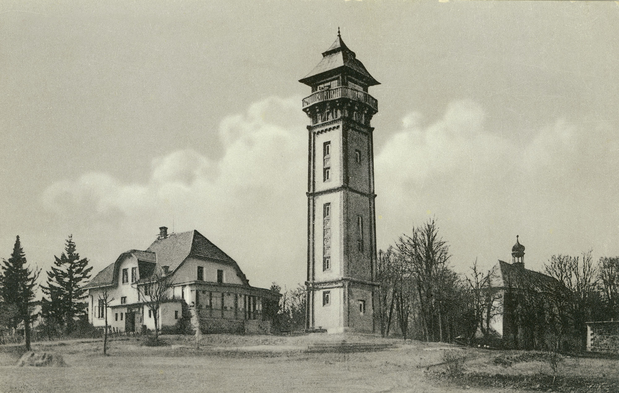 První dřevěnou rozhlednu, vysokou 22 m, postavil jilemnický mistr Pošepný v roce 1888 u staré Sezimovy hospody na zděné podezdívce za 3 200 K. Bohužel po 9 letech musela být rozhledna stržena, protože byla vlivem povětrnostních podmínek v havarijním stavu. Okrašlovací spolek se nenechal odradit a začal shromažďovat peníze na novou, již zděnou rozhlednu. Celkovou částku 25 000 K na stavbu rozhledny a zakoupení Sezimovy hospody dával však obtížně dohromady. Přispívali nejrůznější instituce, okolní obce, mecenáši i členové spolku, neboť přes nejrůznější žádosti nakonec stát nepřispěl na rozhlednu ani korunou. S originálním nápadem přišel spolek v roce 1910, kdy v květnu při tradiční táborské pouti pod průhlednou rouškou sčítání účastníků vybíral od každého jeden jakýkoliv peníz – celkem tak získal 359,48 K.